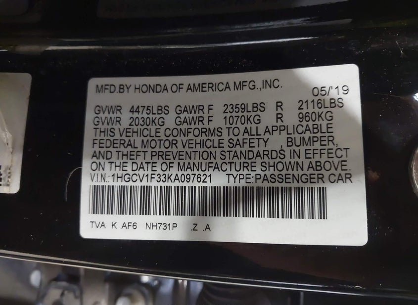 - VIN: 1HGCV1F33KA097621