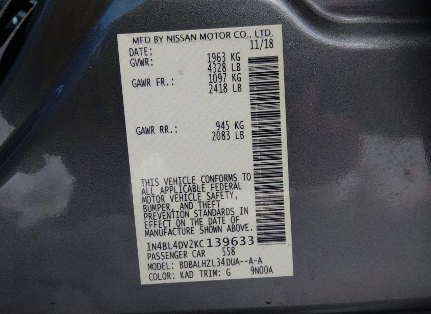 - VIN: 1N4BL4DV2KC139633