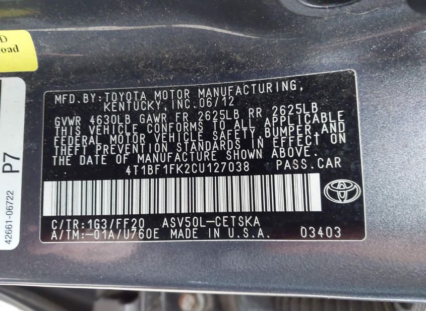 - VIN: 4T1BF1FK2CU127038
