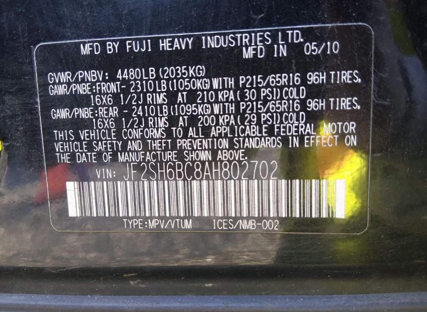 - VIN: JF2SH6BC8AH802702