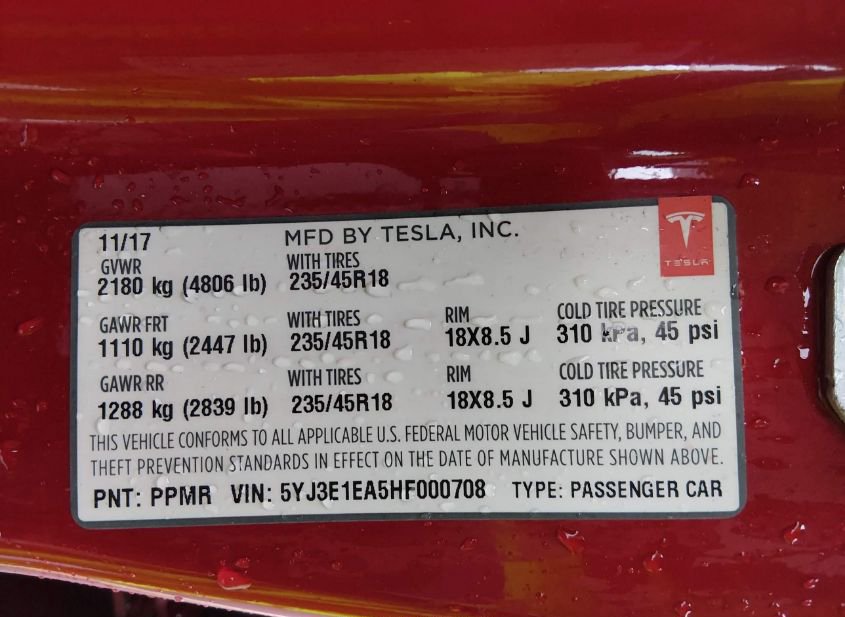 - VIN: 5YJ3E1EA5HF000708