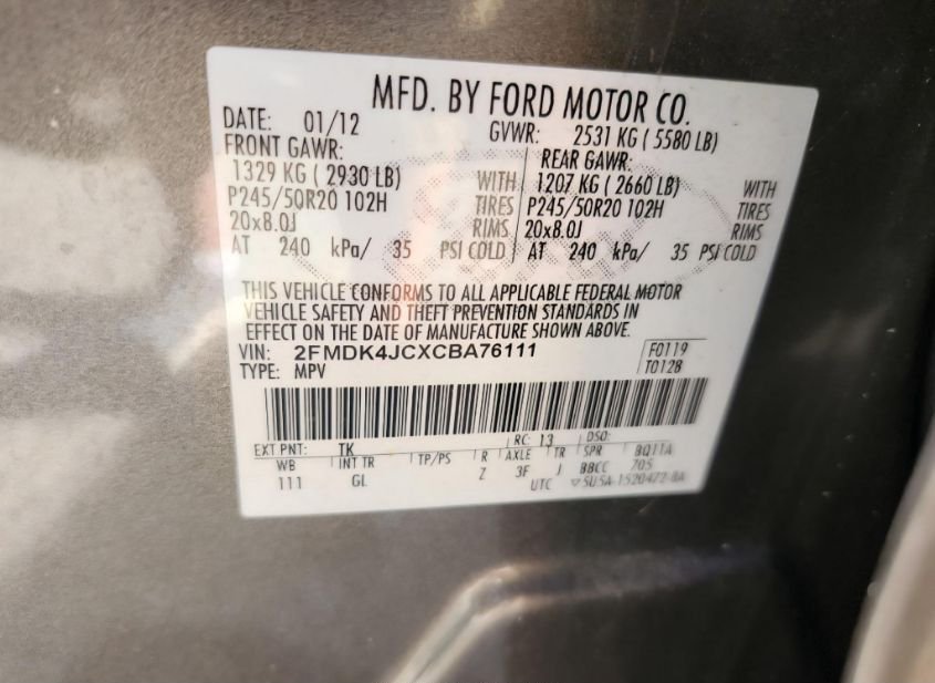- VIN: 2FMDK4JCXCBA76111