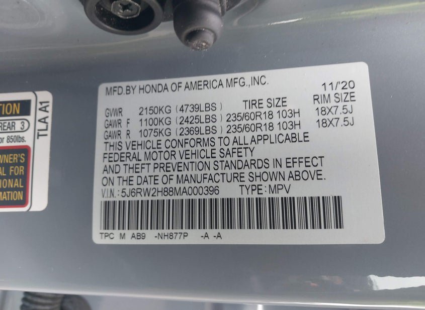 - VIN: 5J6RW2H88MA000396