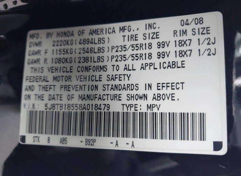 - VIN: 5J8TB18558A018479
