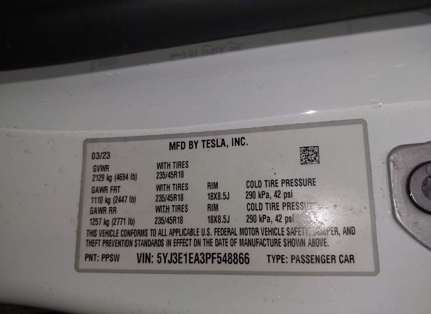 - VIN: 5YJ3E1EA3PF548866