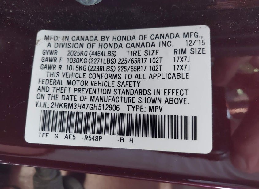 - VIN: 2HKRM3H47GH512906
