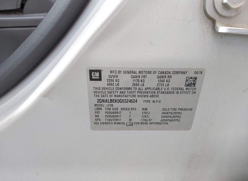 - VIN: 2GNALBEK9G6324624