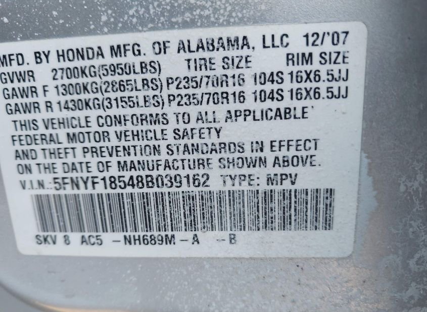 - VIN: 5FNYF18548B039162