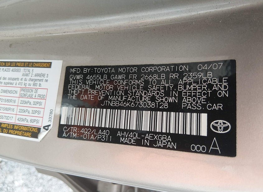 - VIN: JTNBB46K673038128