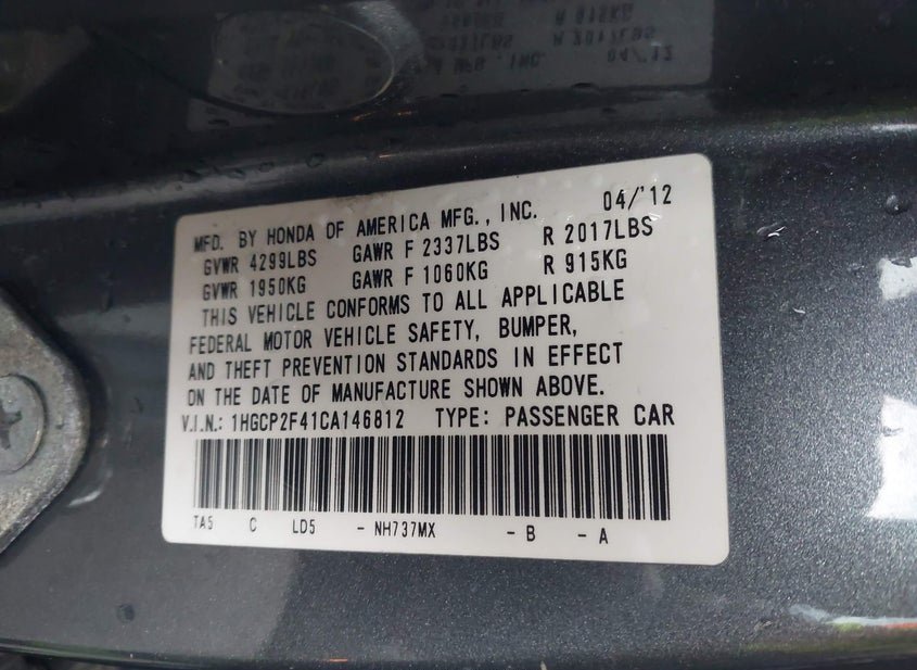 - VIN: 1HGCP2F41CA146812