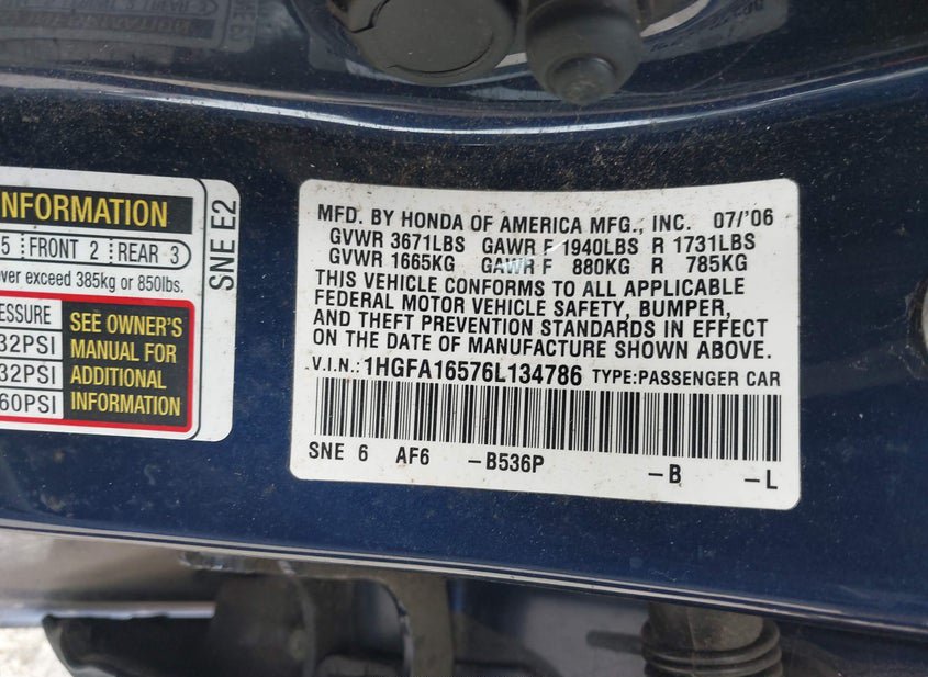 - VIN: 1HGFA16576L134786