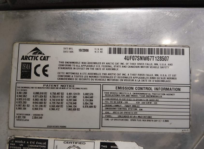 - Название лота: 2007 ARCTIC CAT SNOWMOBILE