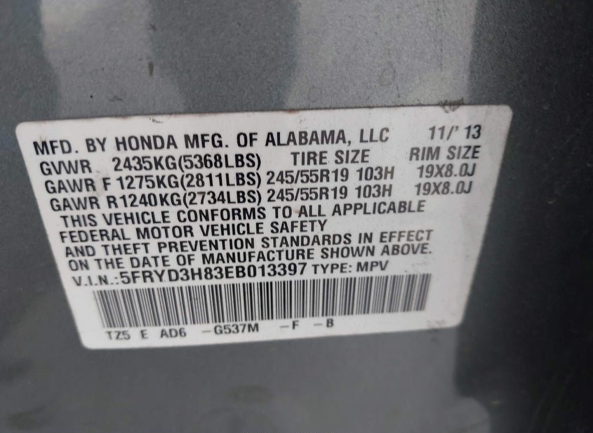 - VIN: 5FRYD3H83EB013397