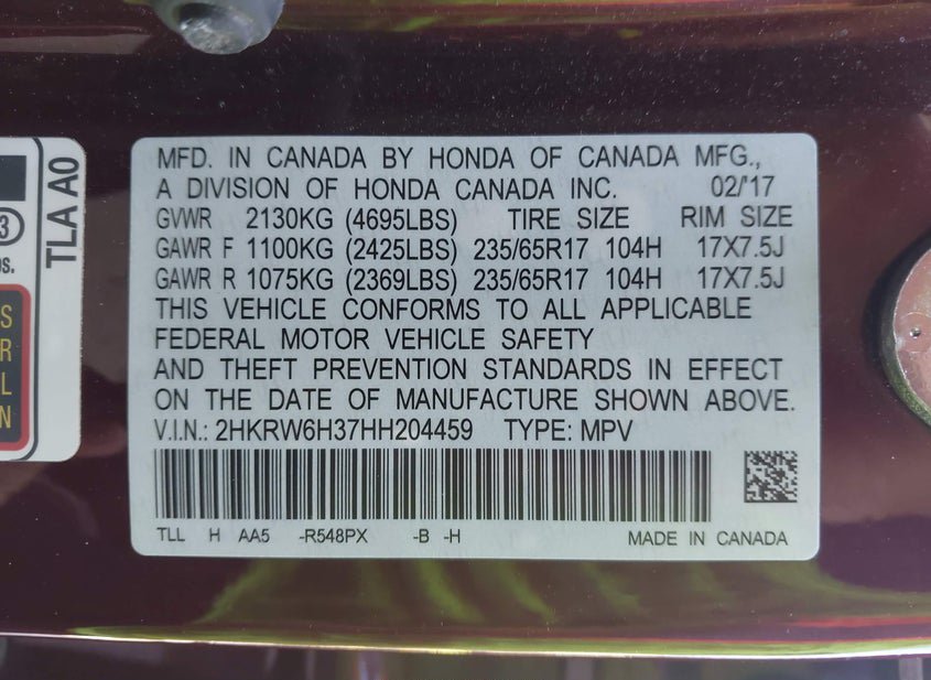 - VIN: 2HKRW6H37HH204459