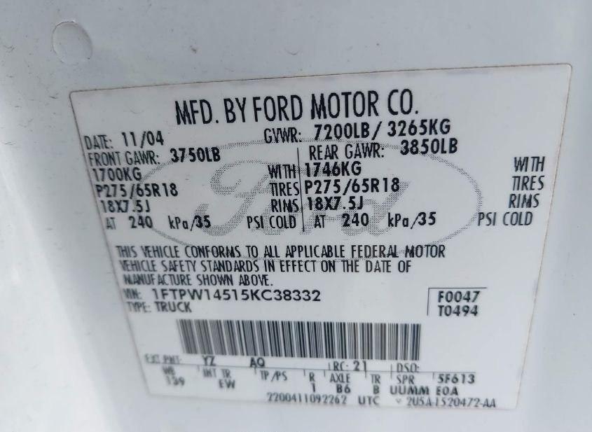 - VIN: 1FTPW14515KC38332
