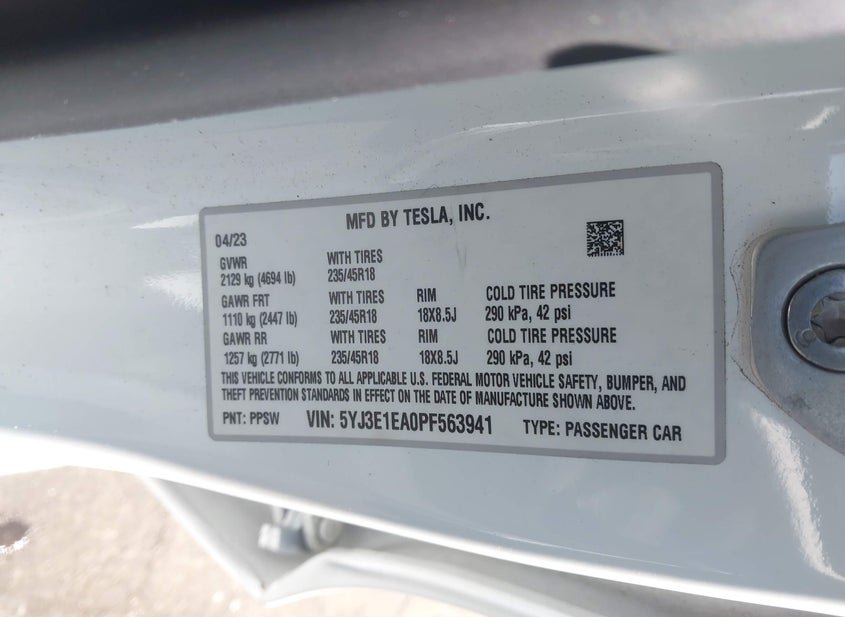 - VIN: 5YJ3E1EA0PF563941