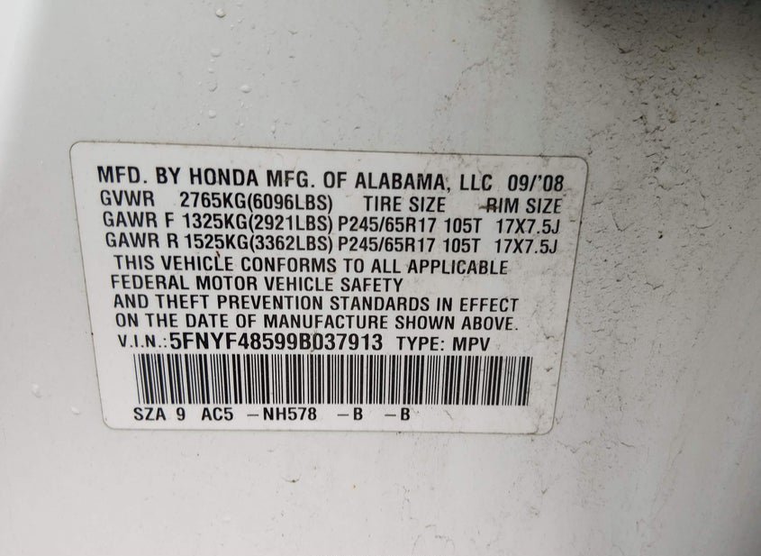 - VIN: 5FNYF48599B037913