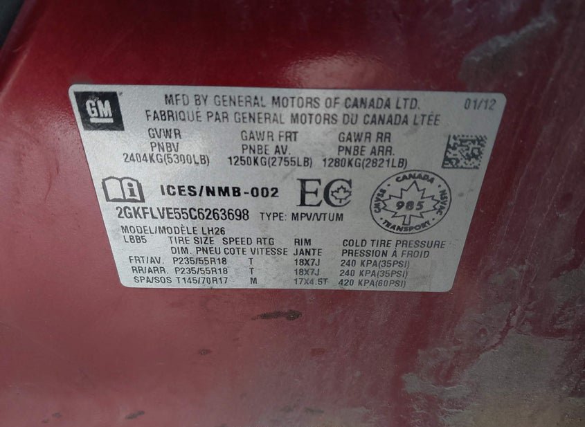 - VIN: 2GKFLVE55C6263698