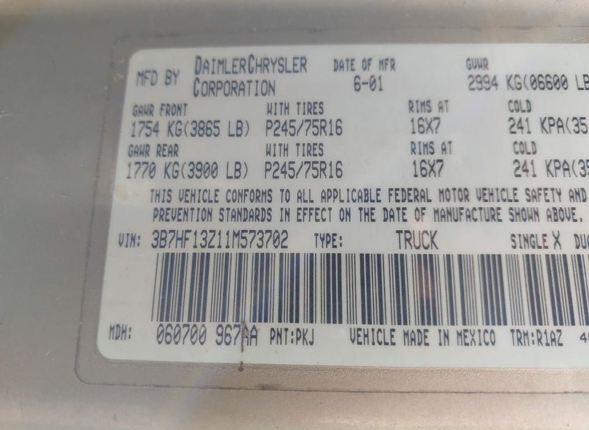 - VIN: 3B7HF13Z11M573702