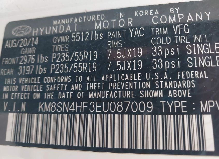- VIN: KM8SN4HF3EU087009