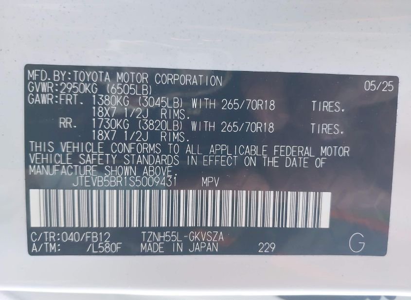 - VIN: JTEVB5BR1S5009431