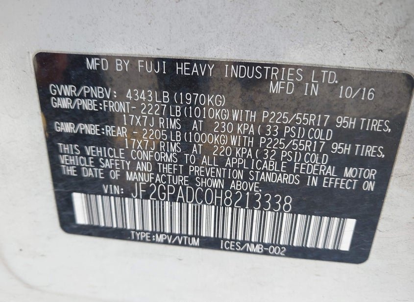 - VIN: JF2GPADC0H8213338