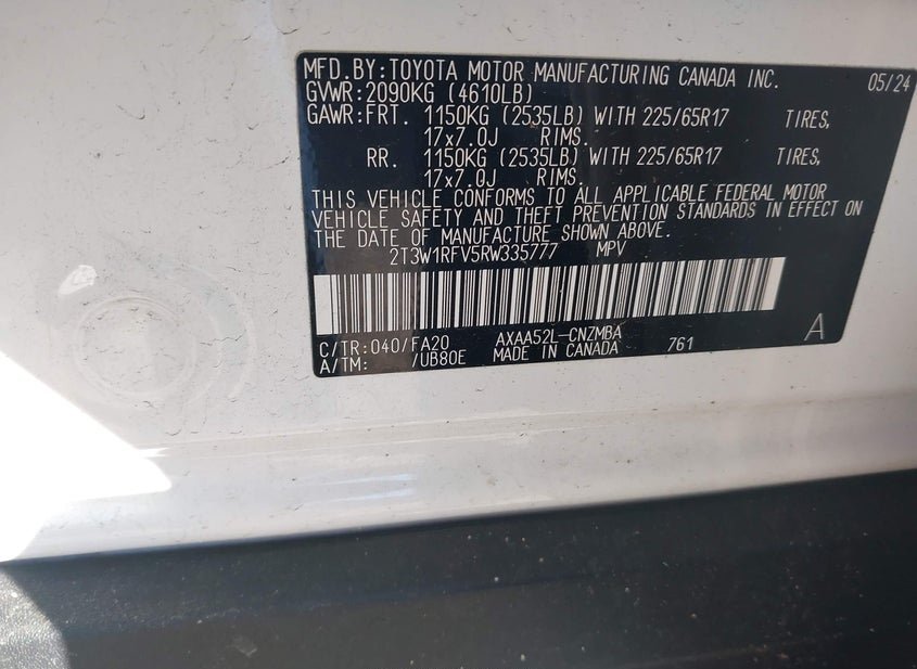 - VIN: 2T3W1RFV5RW335777