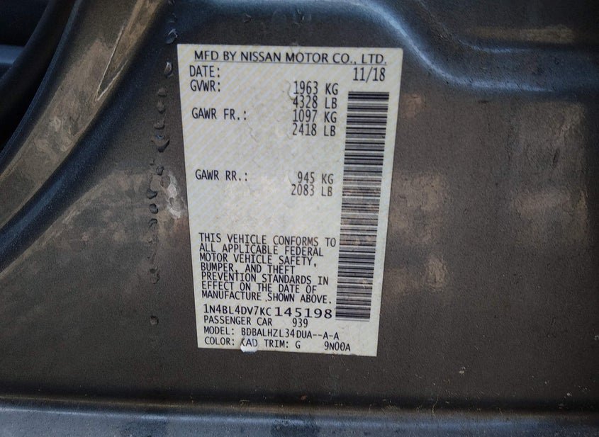- VIN: 1N4BL4DV7KC145198