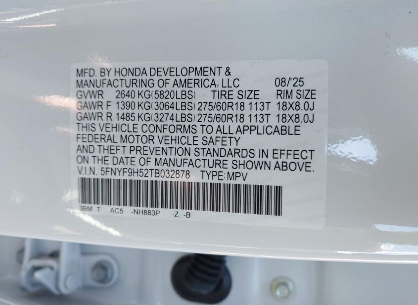 - VIN: 5FNYF9H52TB032878