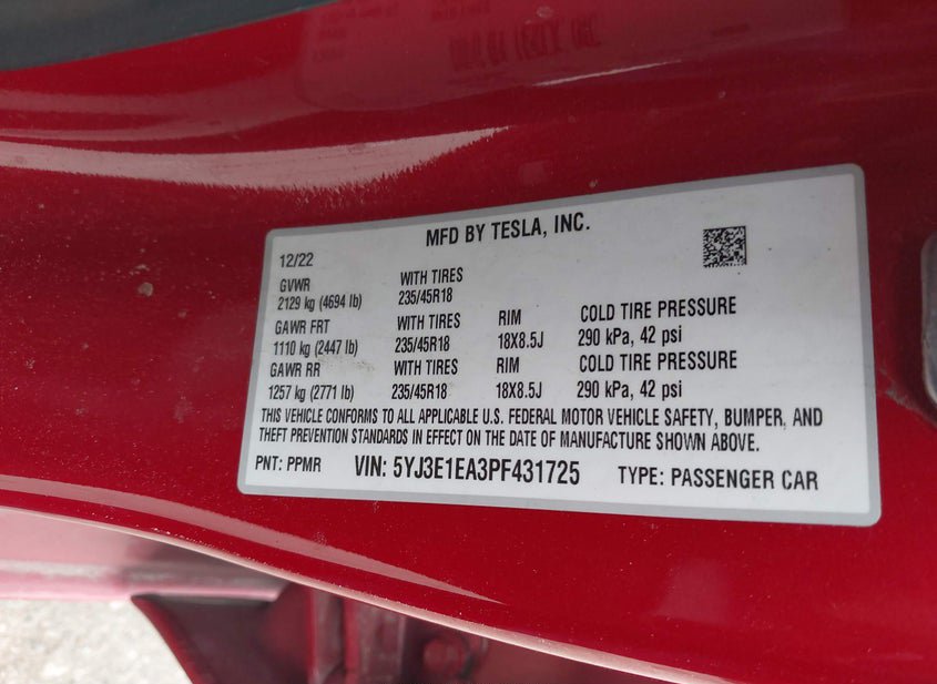 - VIN: 5YJ3E1EA3PF431725