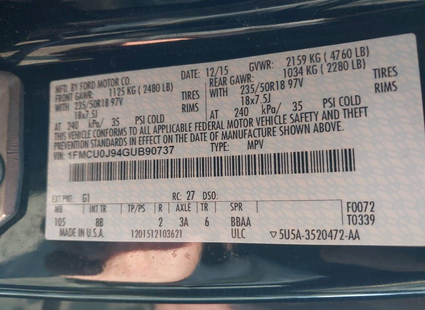 - VIN: 1FMCU0J94GUB90737