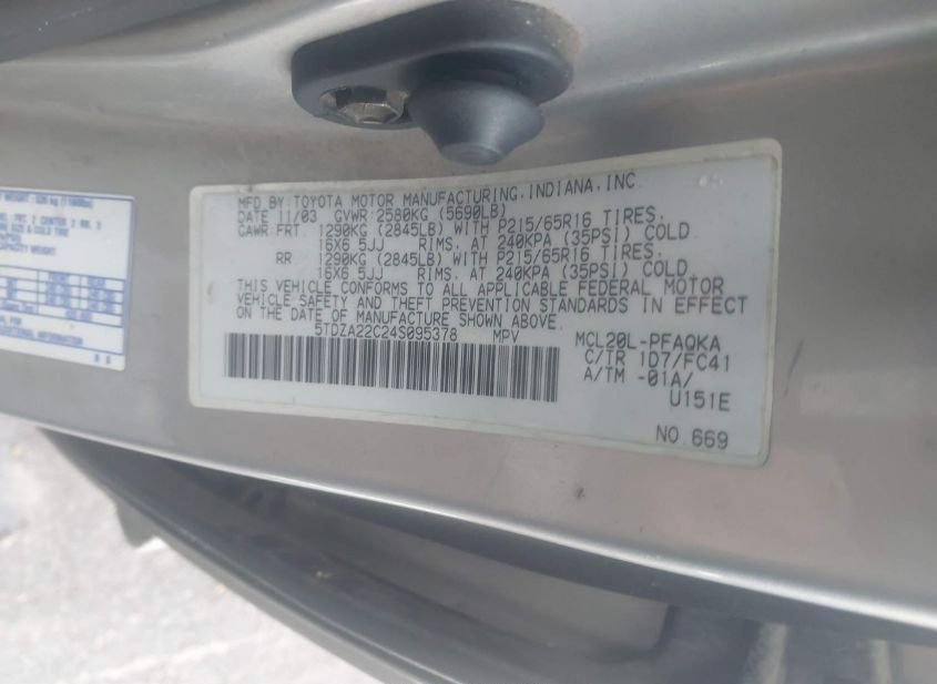 - Название лота: 2004 TOYOTA SIENNA XLE