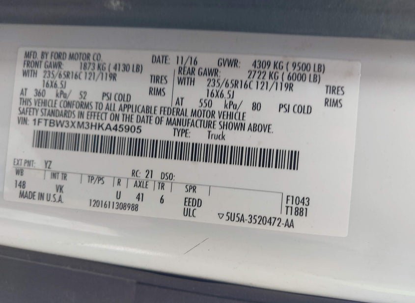 - VIN: 1FTBW3XM3HKA45905