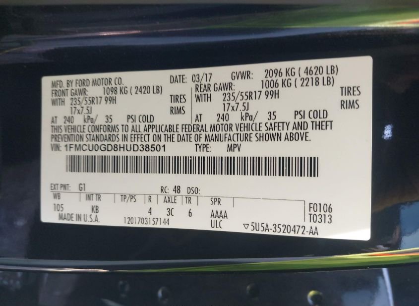- VIN: 1FMCU0GD8HUD38501