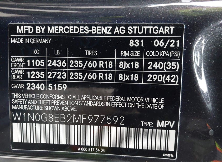 - VIN: W1N0G8EB2MF977592