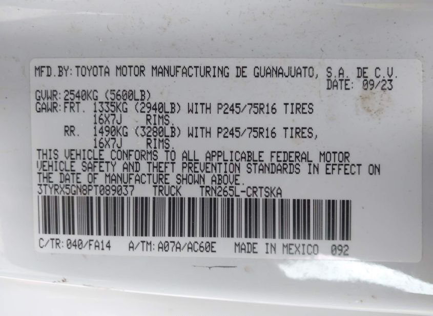 - VIN: 3TYRX5GN8PT089037