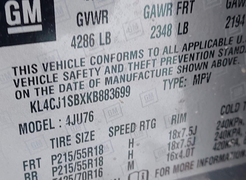 - VIN: KL4CJ1SBXKB883699