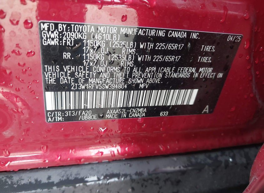 - VIN: 2T3W1RFV5SW394804