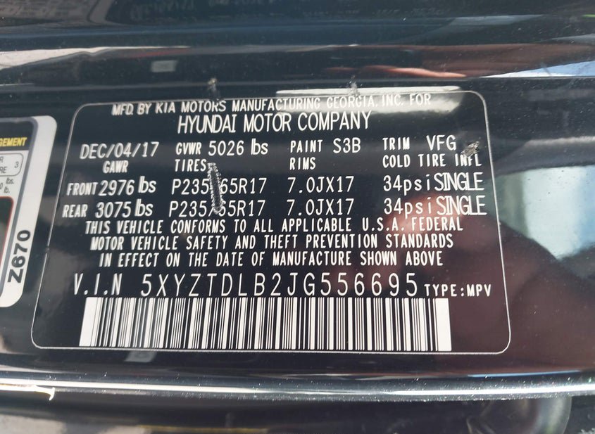 - VIN: 5XYZTDLB2JG556695