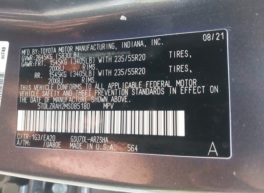 - VIN: 5TDLZRAH2MS085180