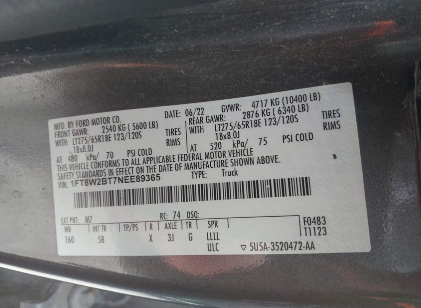 - VIN: 1FT8W2BT7NEE89365