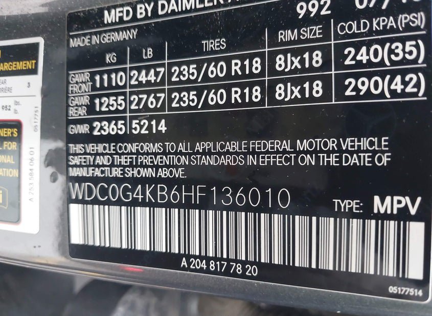 - VIN: WDC0G4KB6HF136010