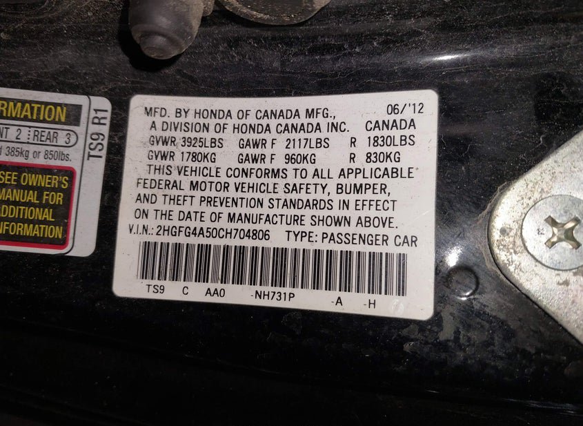 - VIN: 2HGFG4A50CH704806