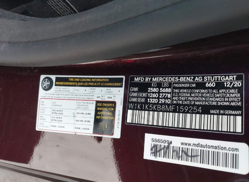 - VIN: W1K1K5KB8MF159254