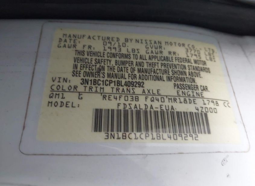 - VIN: 3N1BC1CP1BL409292