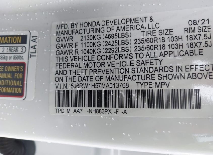 - VIN: 5J6RW1H57MA013768