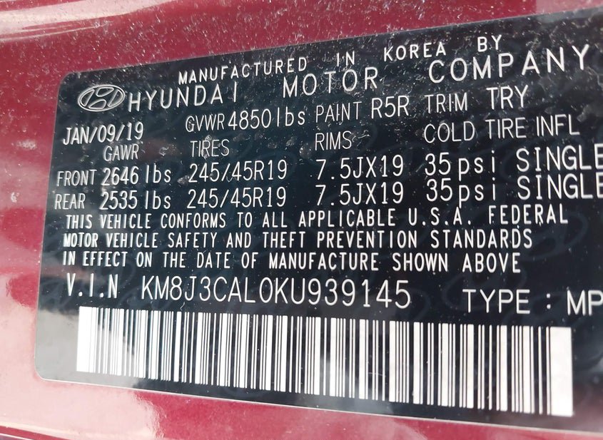 - VIN: KM8J3CAL0KU939145