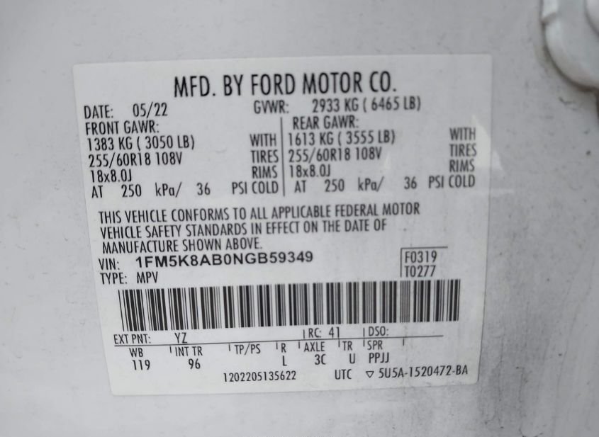- VIN: 1FM5K8AB0NGB59349