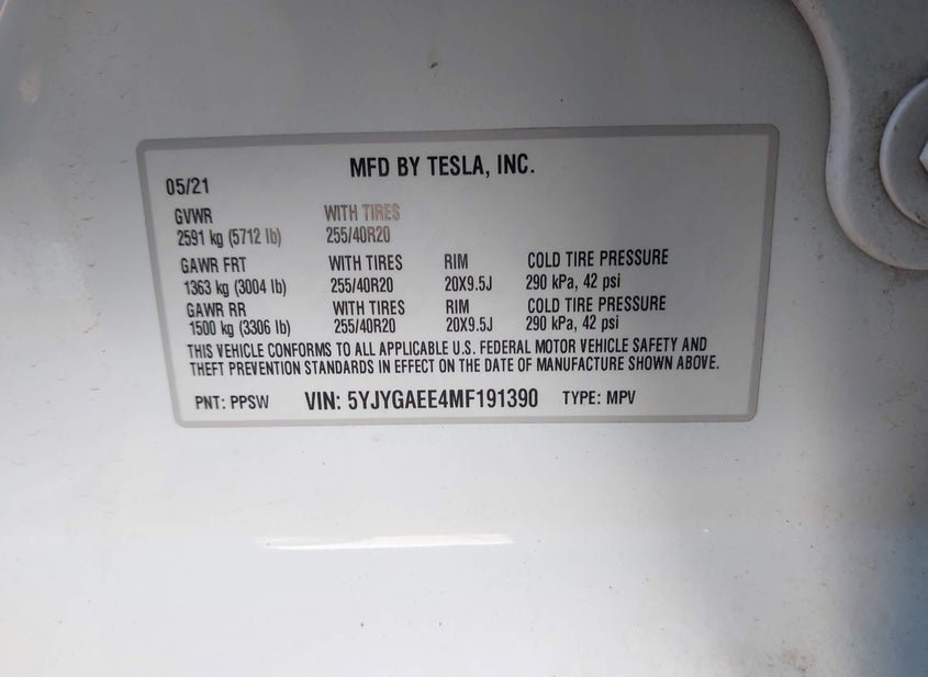 - VIN: 5YJYGAEE4MF191390