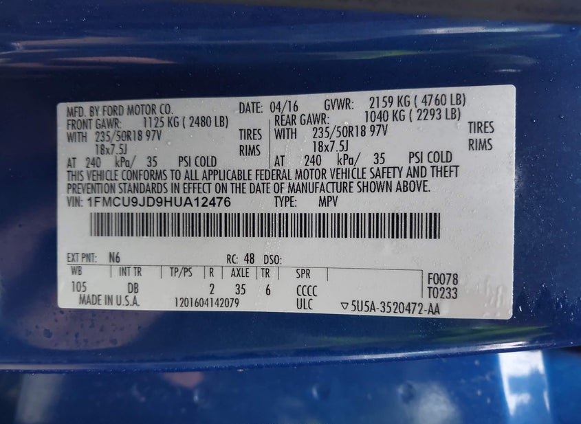 - VIN: 1FMCU9JD9HUA12476